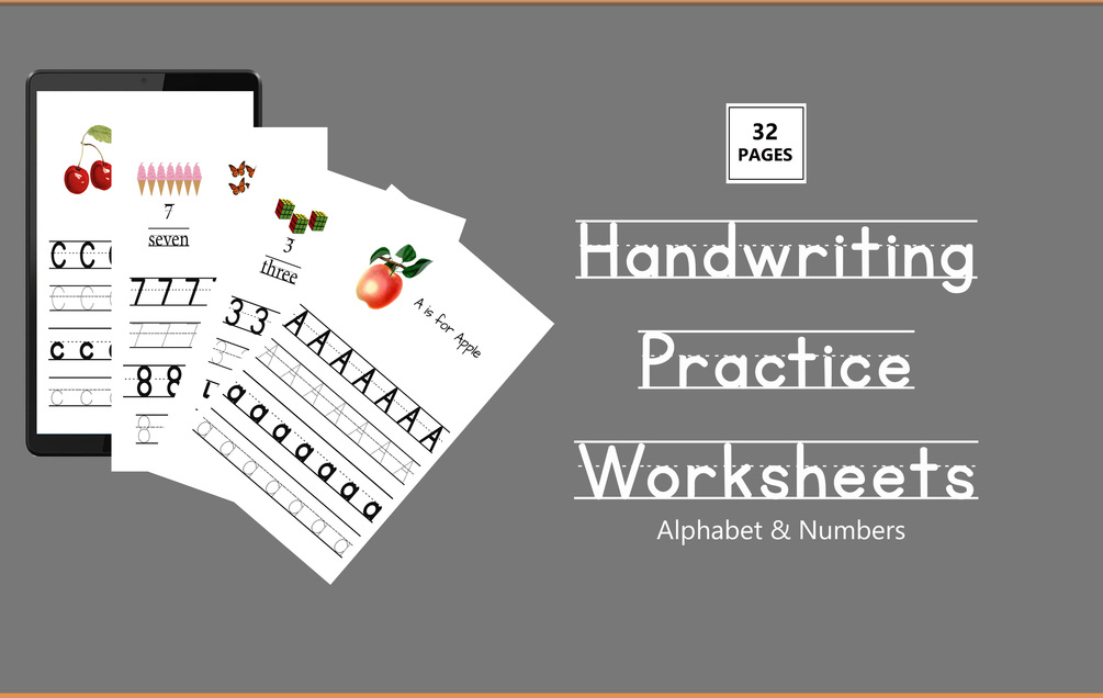 Handwriting Practice Worksheets for Kids, Children, Fruits Design Hand lettering Alphabet ABC Letter and Numbers Tracing